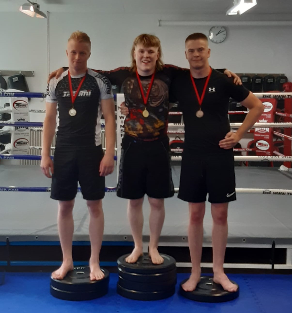HPM:n lukkopainin tulevaisuuden nimet Aatos ”Diskokuningas” Atti (kuvassa keskellä) ja Santeri ”Professori” Luoma kävivät testaamassa kilpailuvalmiuttaan Nokialla heinäkuun ensimmäisenä lauantaina järjestetyissä NogiFight-salikisoissa. Päivän kunnot osoittautuivat rautaisiksi ja molemmat kiipesivät päivän päätteeksi mitalipallille.