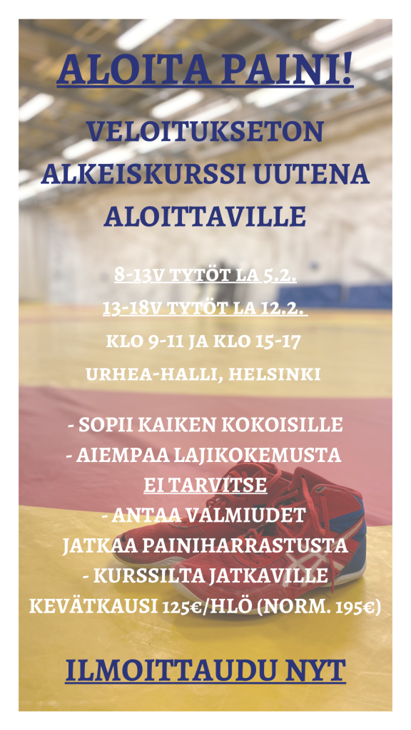 Kurssit sisältävät kaksi kahden tunnin vapaapainiharjoitusta. Osallistuminen on maksutonta. Alkeiskurssien tarkoituksena on madaltaa tyttöjen kynnystä aloittaa painiharrastus. Saat kurssilta valmiudet halutessasi jatkaa lajia seuran tyttö- ja naispainiryhmässä.Aiempaa lajikokemusta ei tarvitse. Kurssi sopii kaiken kokoisille ja kuntoisille. Käymme harjoituksissa ensin läpi painin sääntöjä sekä päivän harjoitusten sisältöä. Teemme monipuoliset alkulämmittelyt, joiden jälkeen harjoittelemme pareittain painin perusliikkeitä: erilaisia kaatoja ja heittoja, niiden puolustamista sekä mattopainia. Lisäksi kisailemme paria vastaan lyhyitä otteluharjoituksia opituista liikkeistä.